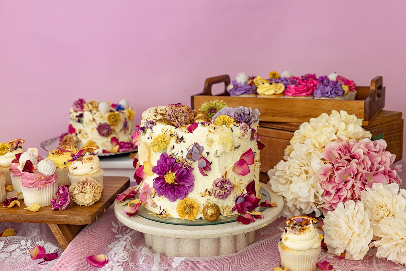 Pre Designed Signature Cakes adorned with delicate preserved edible blooms, Luxurious Cupcakes with exquisite decorations, Artisanal Gifts and Divine Desserts.