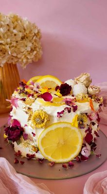 Indulge in the ultimate luxury dessert experience with our exquisite Classic Vanilla & Lemon Curd Cake dressed with floral confetti for that extra special touch. Moist, velvety vanilla sponge is lavishly filled and covered with a heavenly French vanilla cream and a tangy, zesty lemon curd, expertly balanced to create a sumptuous taste sensation like no other. The smooth, creamy texture, paired with the tangy lemon curd, will transport you to a world of pure bliss.