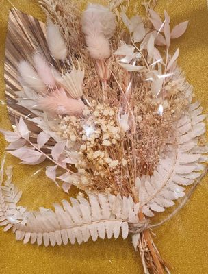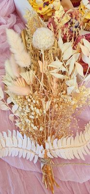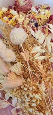 A beautiful and luxurious curated gift hamper showcasing luxe cupcakes and lovely dried floral posy.