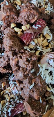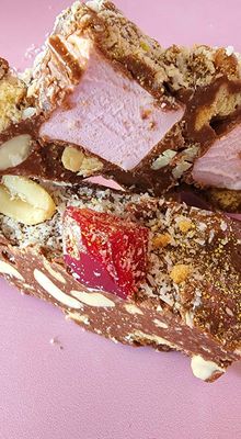 A delightful experience for chocolate lovers. Our Luxe Rocky Road is a blend of handcrafted perfection and quality ingredients. Made with milk chocolate, biscuits, raspberry lollies, peanuts, coconut and fluffy marshmallows. Every bite is pure indulgence!